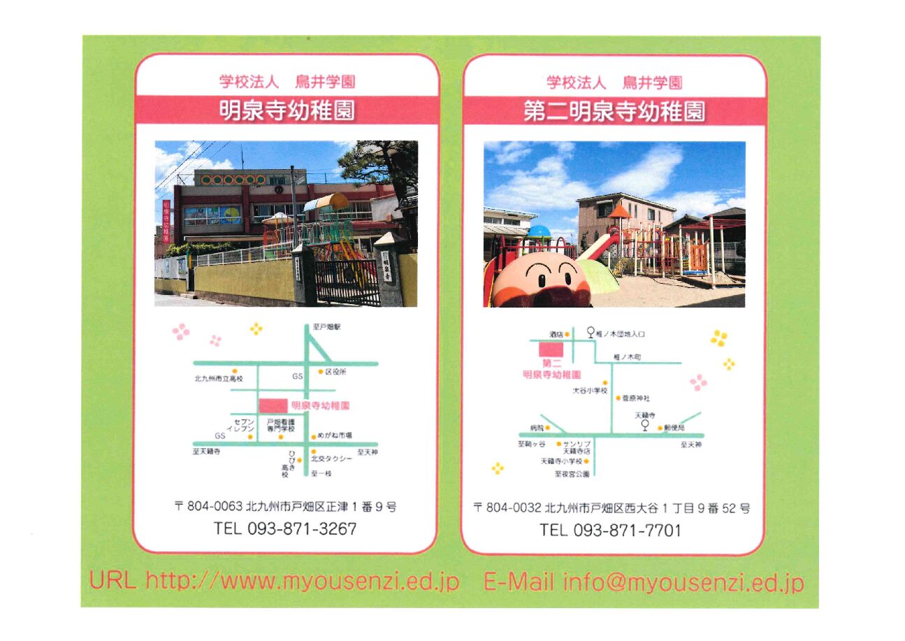 明泉寺幼稚園🍀第二明泉寺幼稚園では 令和8年度の入園願書受付を開始いたしました✨ 受付開始日:11月4日(火)~ 受付時間:8時~17時 受付場所:各園 事務室 ※ご不明な点がございまし…